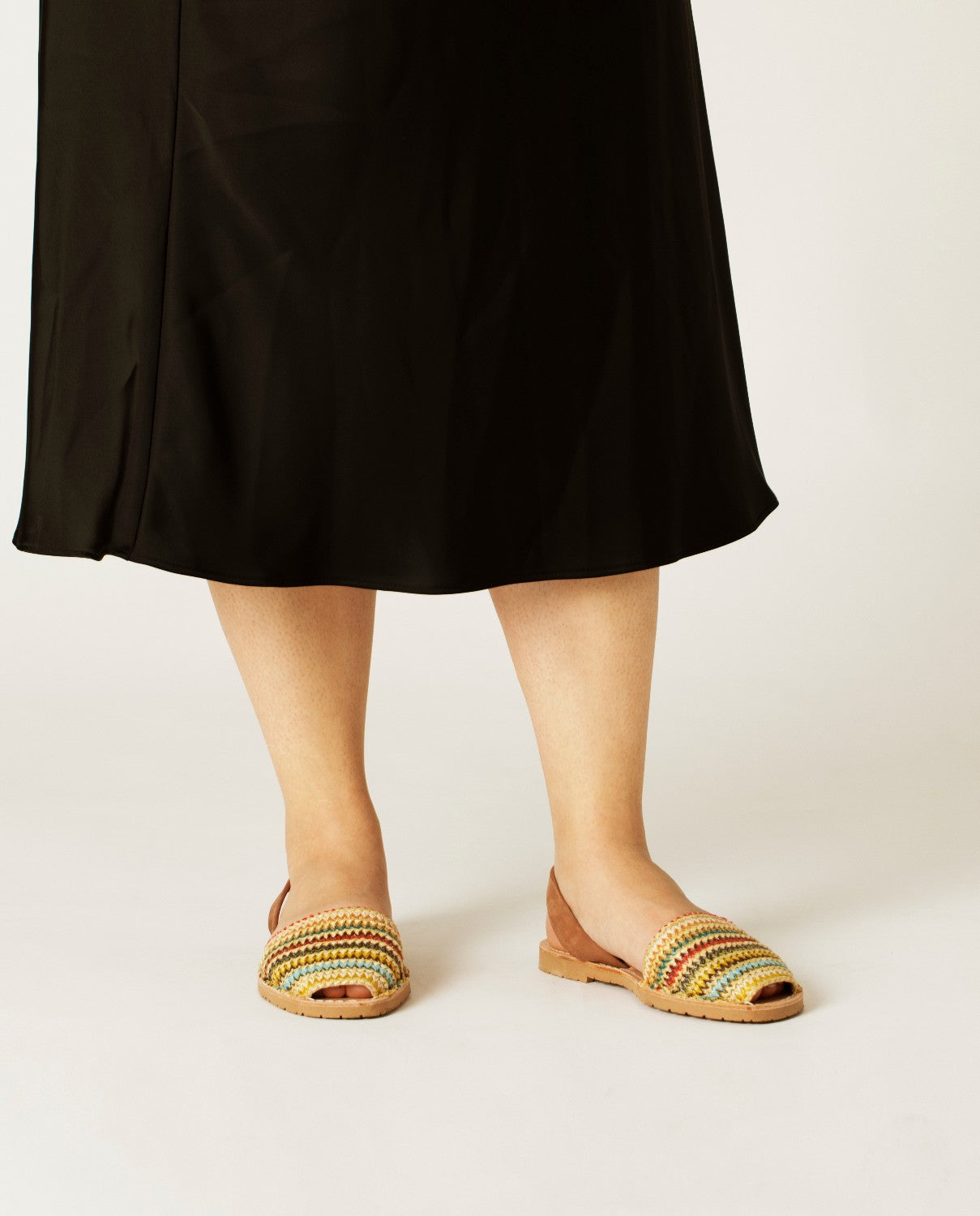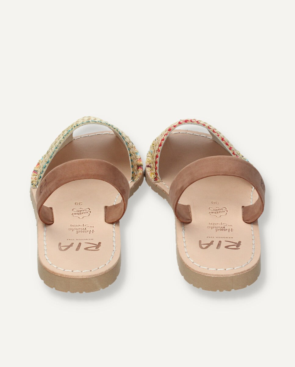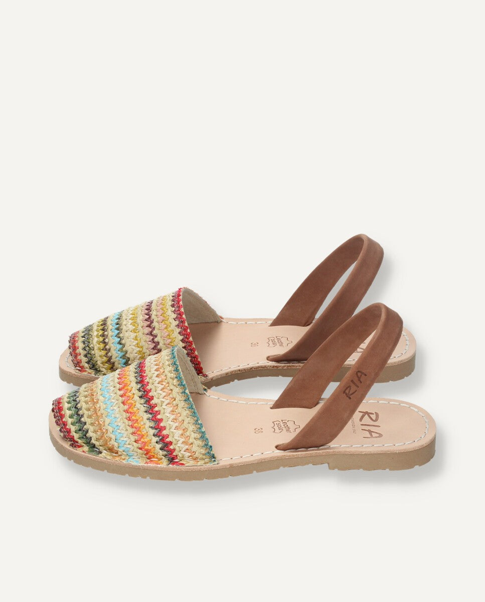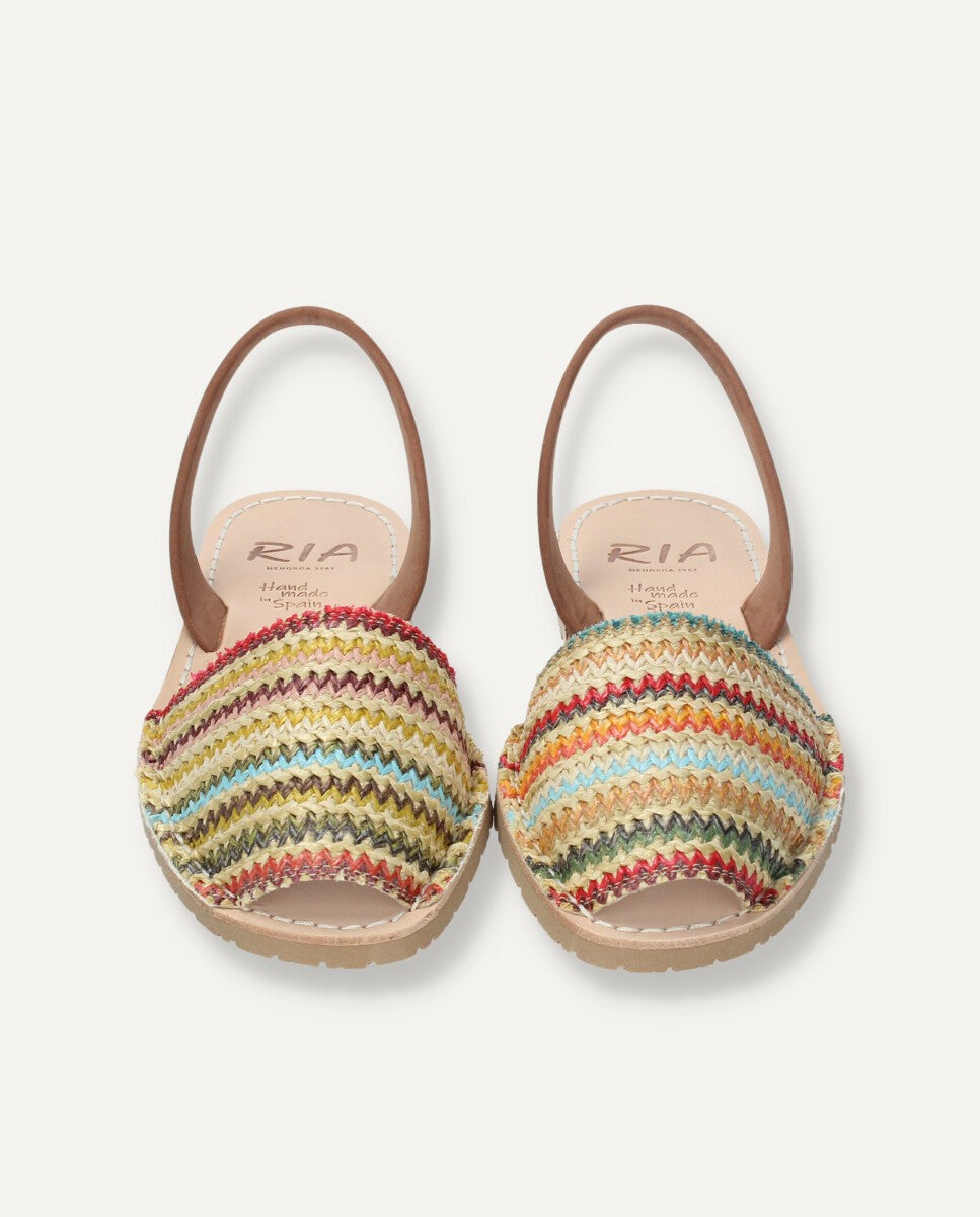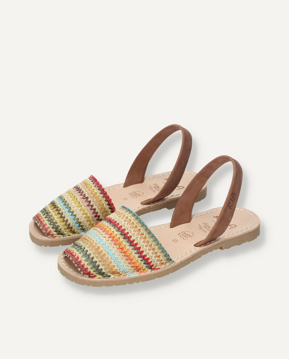 Originales menorquinas elaboradas con una combinación de rafia que simula un estampado étnico. La multitud de colores de la pala la hacen una abarca ideal para cualquier look de verano, aportando un toque diferente.